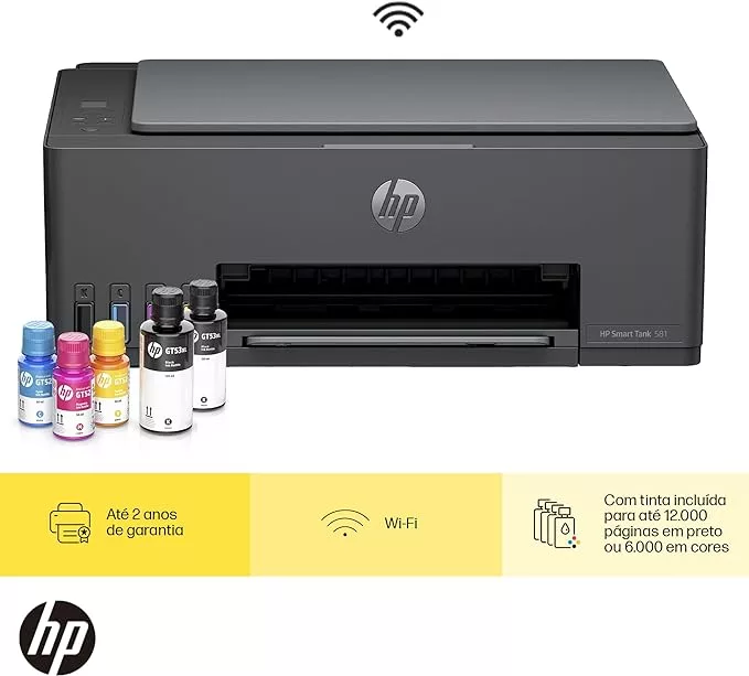 Impressora Multifuncional HP Smart Tank 581 Tanque de Tinta Colorida Wi-Fi com autorreparo, USB – Impressora, Copiadora e Scanner Cor: Cinza Chumbo (4A8D5A)