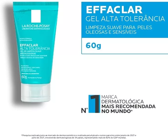 La Roche-posay Effaclar Gel Alta Tolerância. Gel de Limpeza Facial. Limpa a Pele Suavemente Reduzindo a Oleosidade e Eliminando o Brilho. Limpeza Facial. Pele Oleosa e Sensível. Caprylyl Glycol, Glicerina, PCA de Zinco.